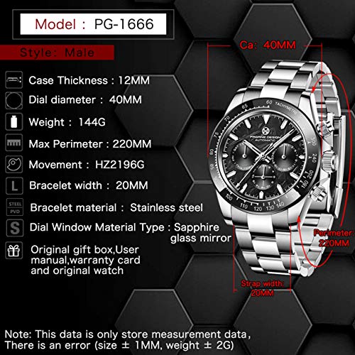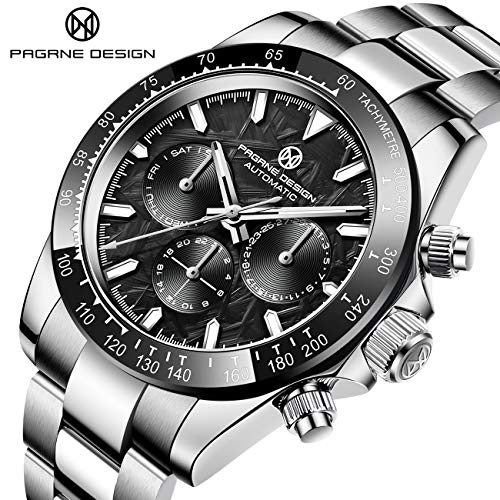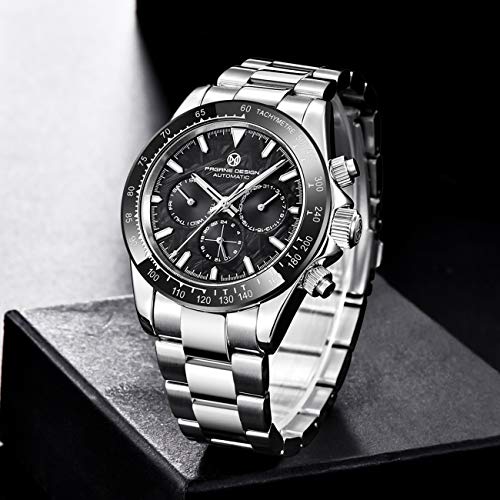 Specificaties: PAGRNE DESIGN Mannen Horloges Krasbestendig Synthetische Saffierglas Automatische Polshorloge Datumweergave 100 M Waterdichte Horloges voor Mannen Rvs Armband